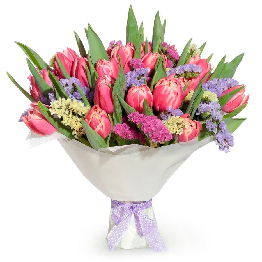 Тюльпан пионовидный розовый, статица микс (желтая, сиреневая). Упаковка (лента, пленка, крафт, сетка, пленка матовая)