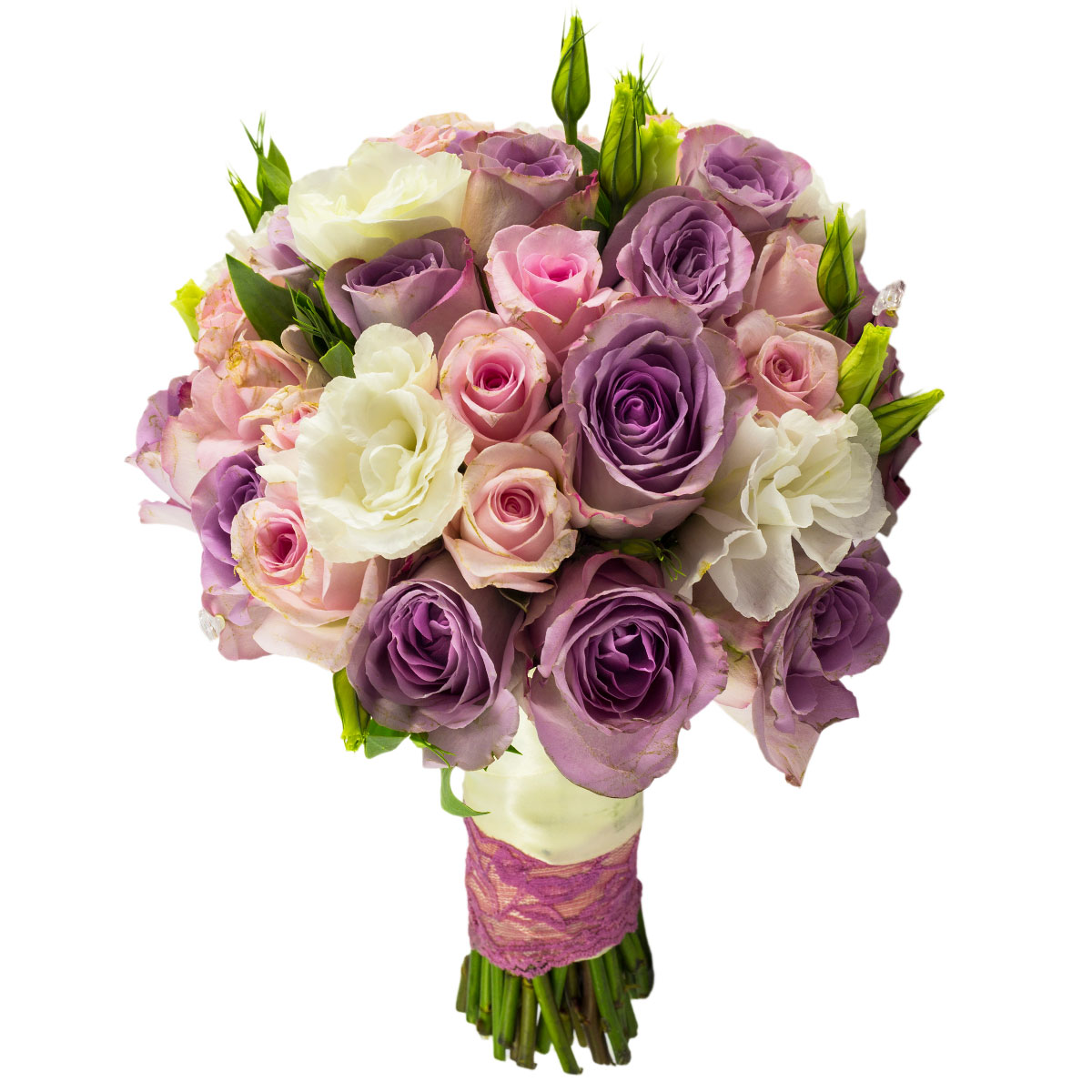 Роза одноголовая розовая и сиреневая, лизиантус белый. Упаковка (лента, пленка, крафт, сетка, пленка матовая)