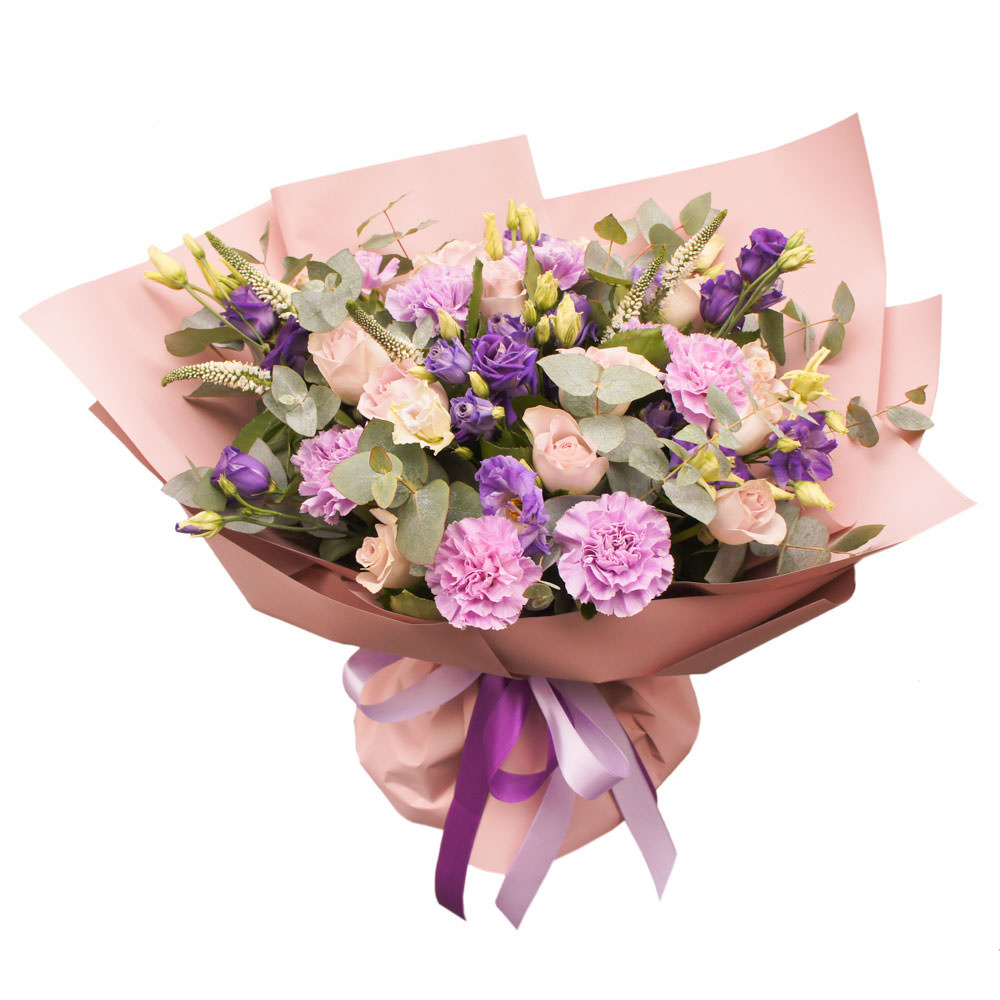 Эустома фиолетовая, гвоздика сиреневая, роза кустовая розовая, вероника эвкалипт. Упаковка (лента, пленка, крафт, сетка, пленка матовая)