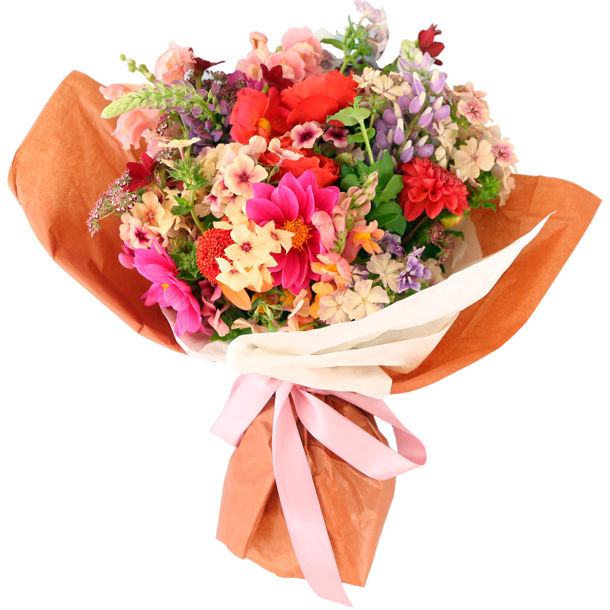 Георгина розовая и красная, люпин сиреневый, флокс. Упаковка (лента, пленка, крафт, сетка, пленка матовая)