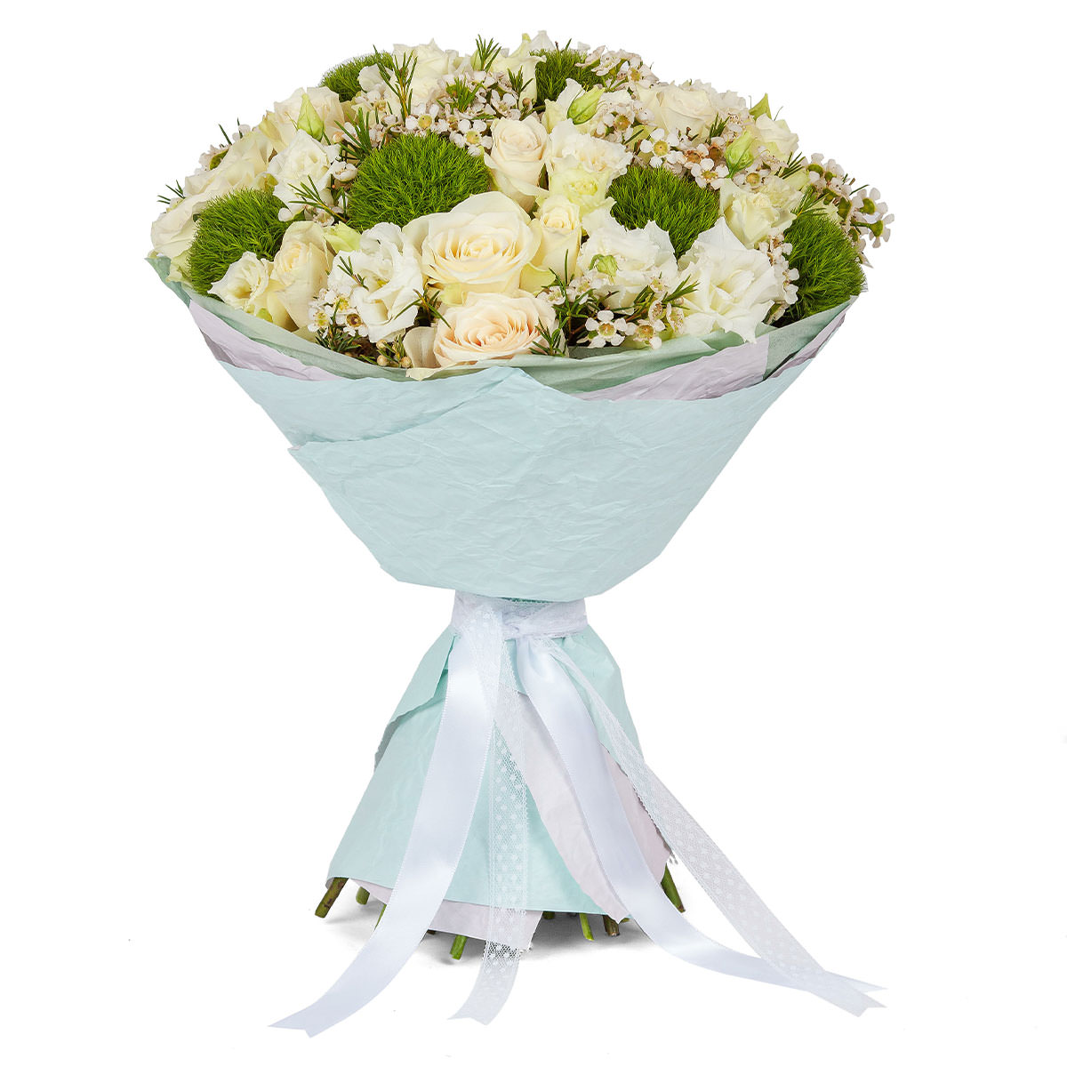 Роза одноголовая белая, роза кустовая белая, эустома белая, гвоздика диантус зеленая, ваксфлауэр, Упаковка (лента, пленка, крафт, сетка, пленка матовая)