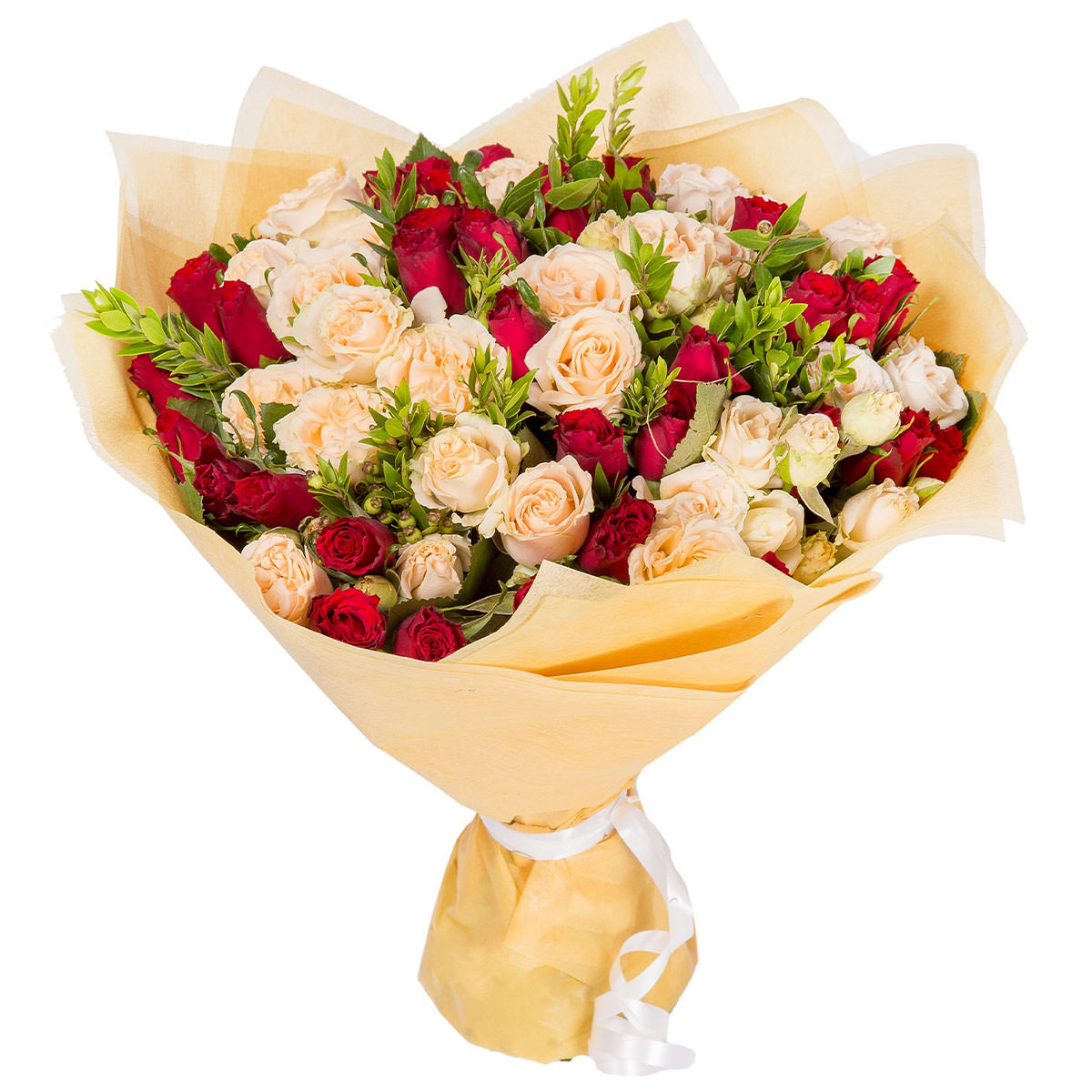 Роза кустовая чайная и розовая, зелень. Упаковка (лента, пленка, крафт, сетка, пленка матовая)