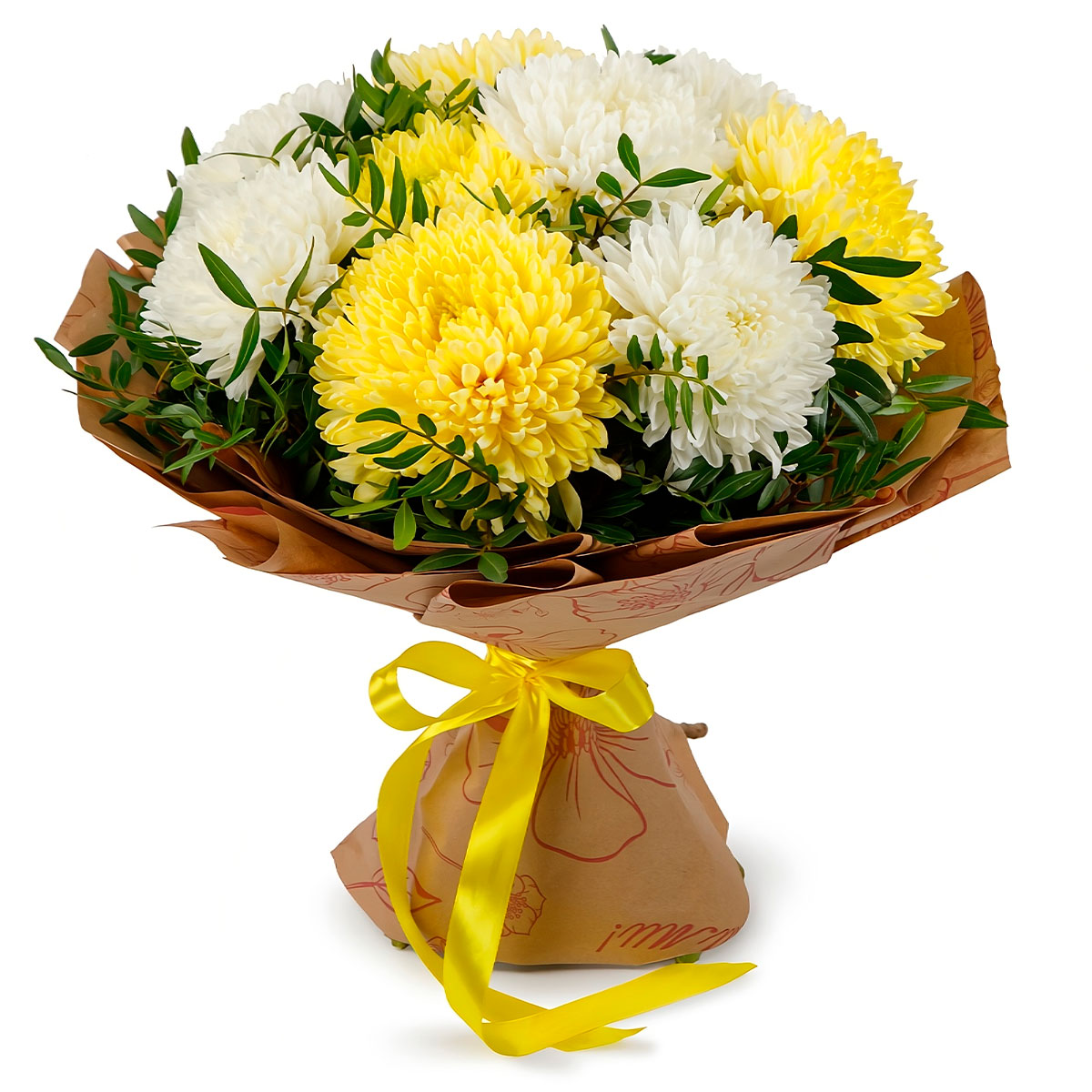 Хризантема одноголовая белая, желтая, зелень. Упаковка (лента, пленка, крафт, сетка, пленка матовая)