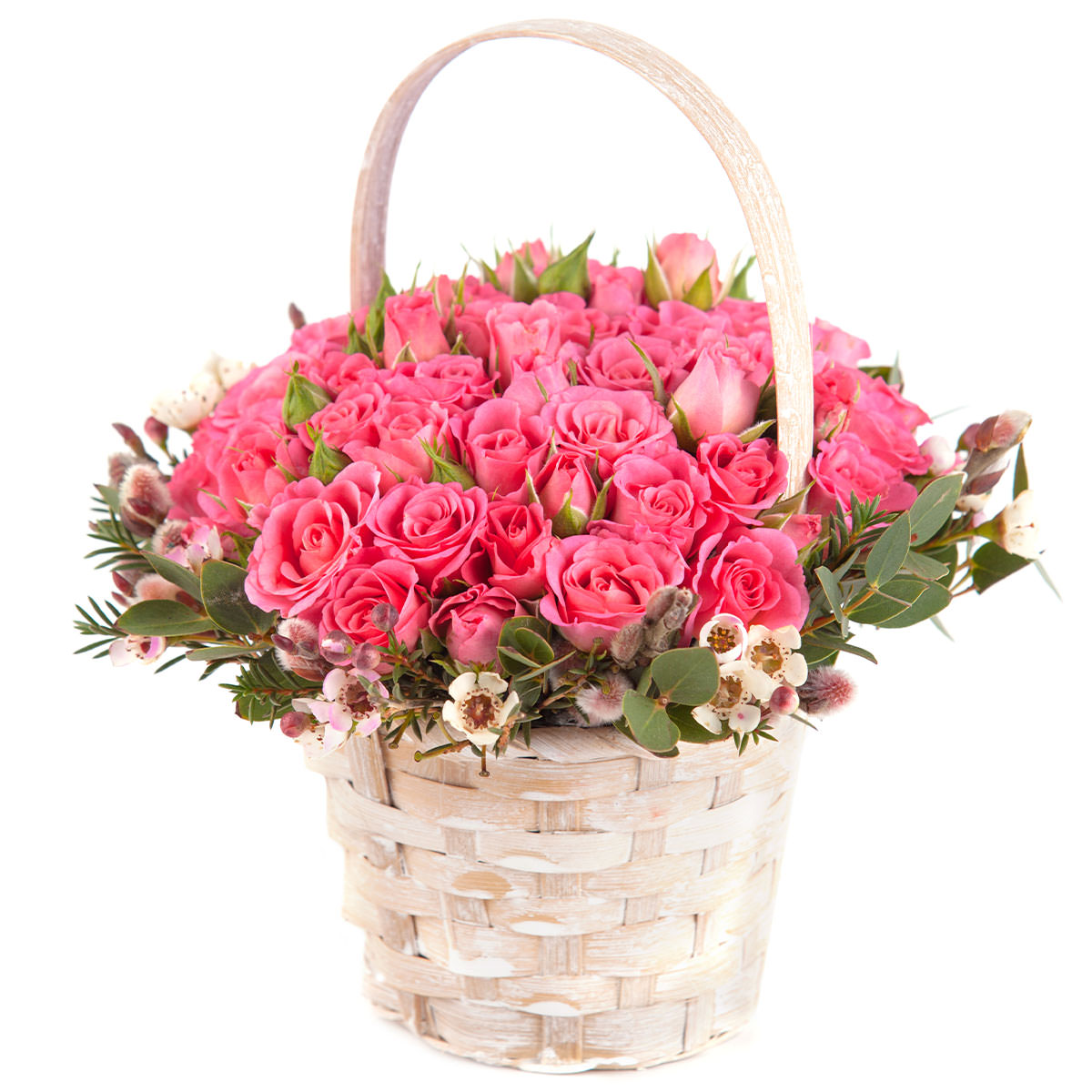 Роза одноголовая розовая, хамелациум восковой мирт, верба, эвкалипт. Упаковка (Корзина, оазис, ящик).
