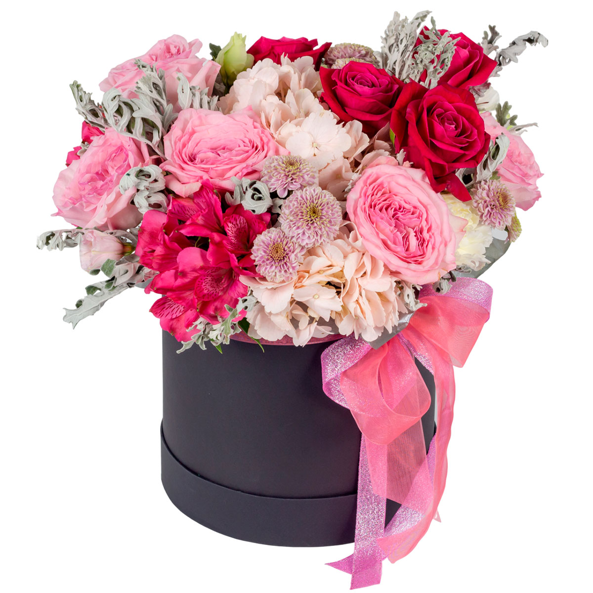 Роза пионовидная светло розовая, роза одноголовая розовая, гортензия кремовая, хризантема кустовая розовая. Упаковка (шляпная коробка, квадратный бокс, коробка сердце, оазис)