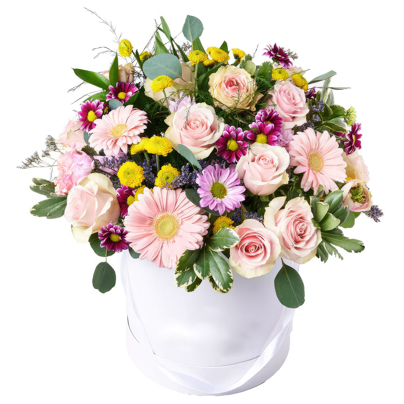 Роза одноголовая розовая, гербера розовая, хризантема кустовая микс (сиреневая, розовая, желтая), эвкалипт, зелень. Упаковка (шляпная коробка, квадратный бокс, коробка сердце, оазис)