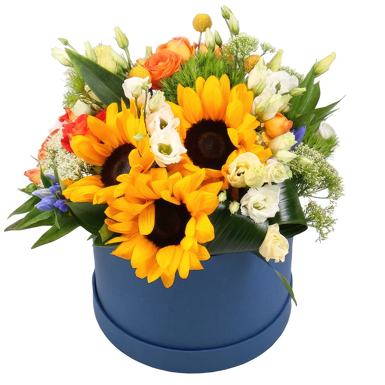 Цветы в коробке «Подсолнечное настроение» с доставкой по г Верхняя Пышма: вы можете заказать букет в гипермаркете цветов «Флормания» по цене от 3390 руб.