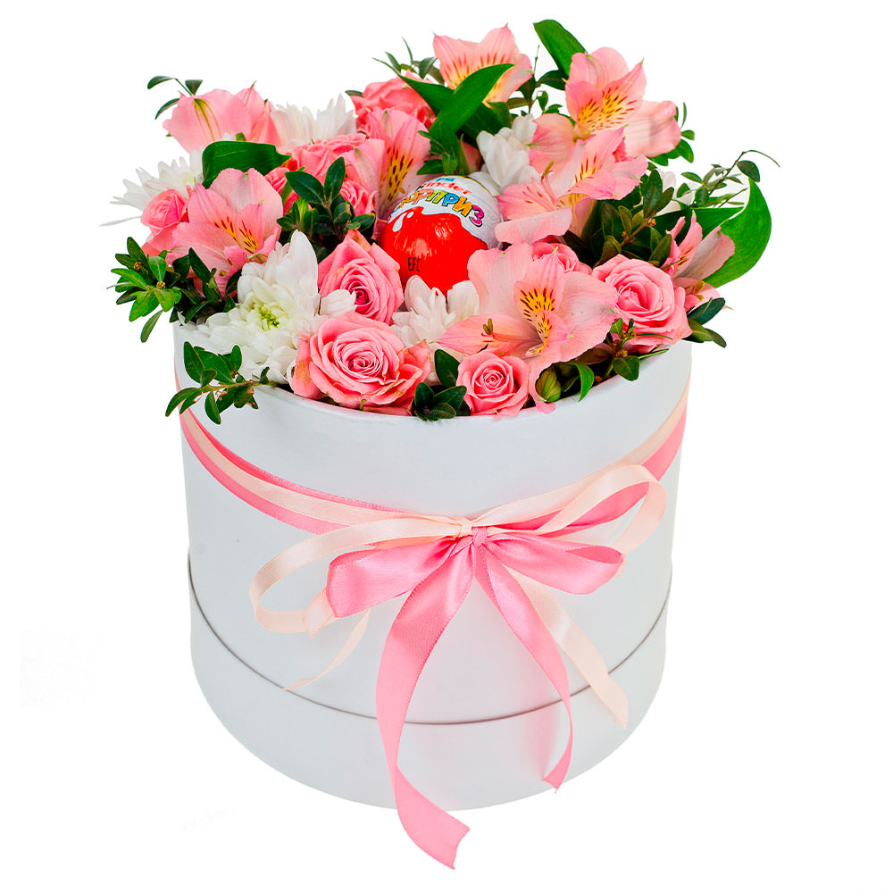 Роза кустовая розовая, альстромерия розовая, хризантема кустовая белая, яйцо киндер, зелень. Упаковка (шляпная коробка, квадратный бокс, коробка сердце, оазис)