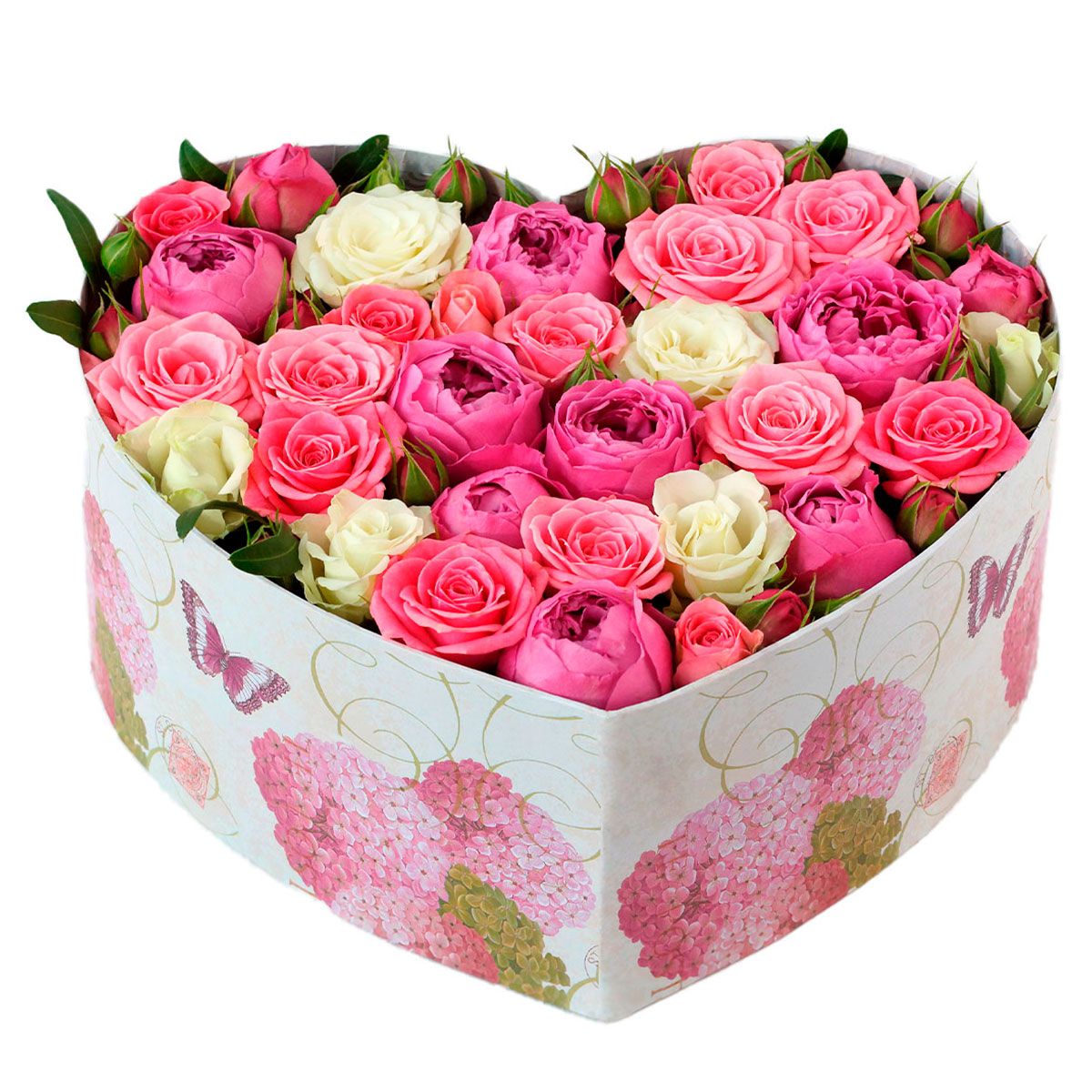 Роза пионовидная розовая, роза кустовая розовая и белая. Упаковка (шляпная коробка, квадратный бокс, коробка сердце, оазис)