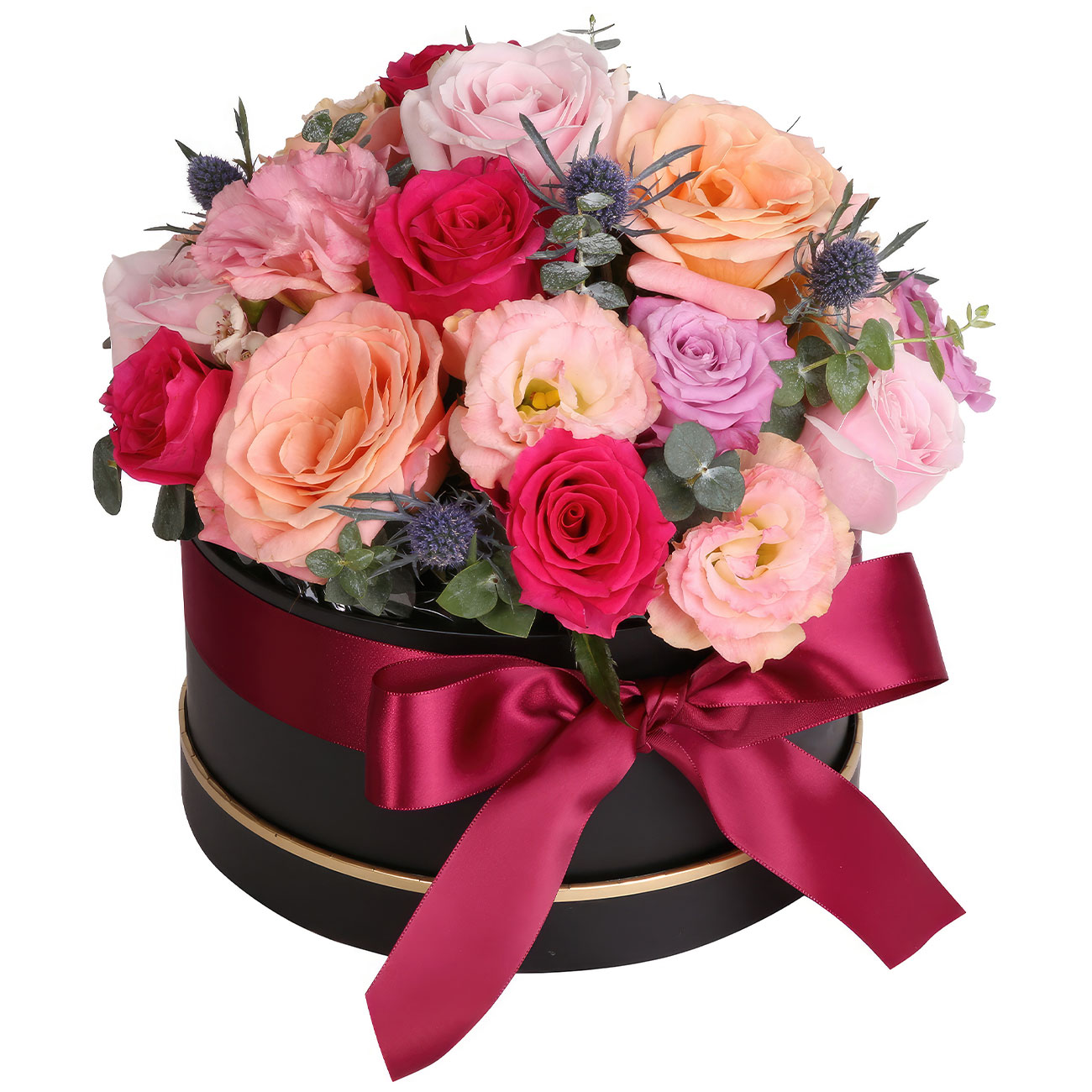 Эустома персиковая, роза одноголовая микс (розовая, сиреневая), эвкалипт. Упаковка (шляпная коробка, квадратный бокс, коробка сердце, оазис)